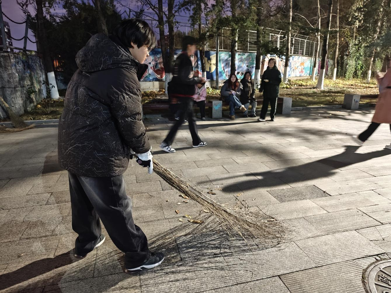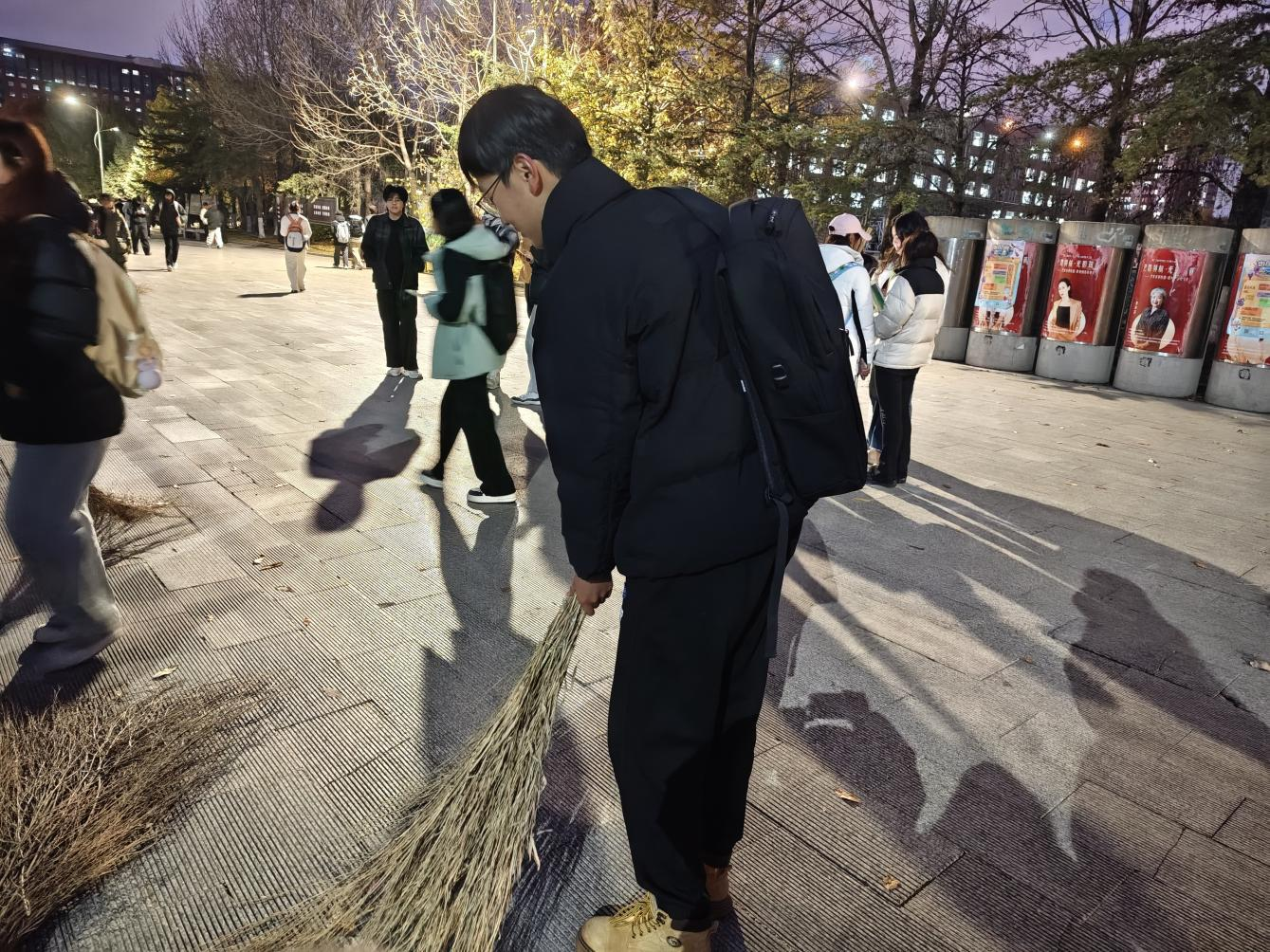 活动开始,志愿者们在指定地点有序集合,负责人详细讲解活动流程与安全注意事项,特别提醒大家勿触碰玻璃碎片等危险物品、可自备手套与垃圾袋,同时叮嘱志愿者们傍晚气温较低需做好保暖。随后,志愿者们分组前往电影学院卫生负责区——图书馆前空场地及南门保安亭等地,迅速投入清洁工作。