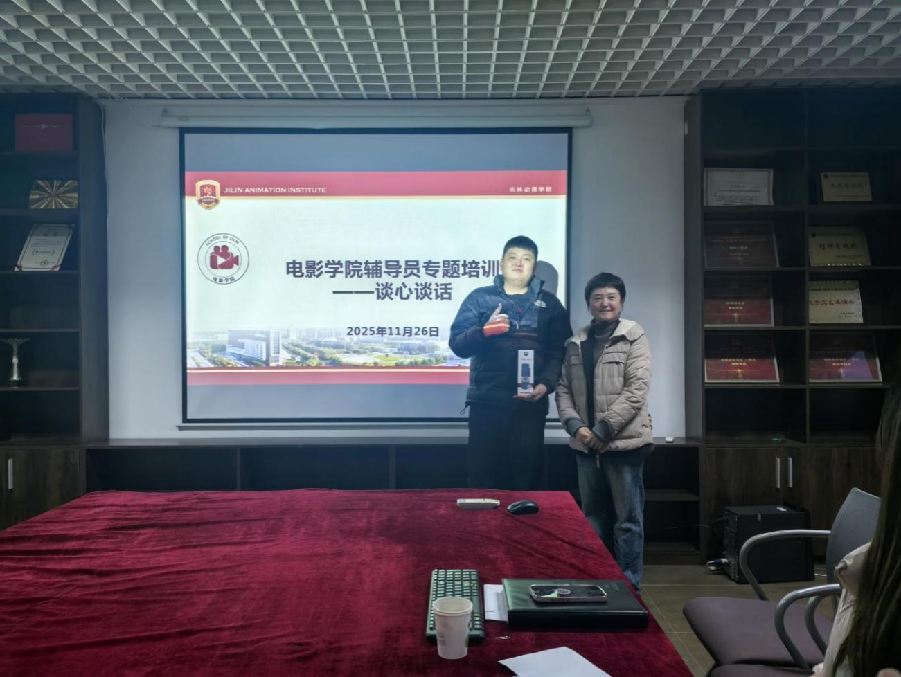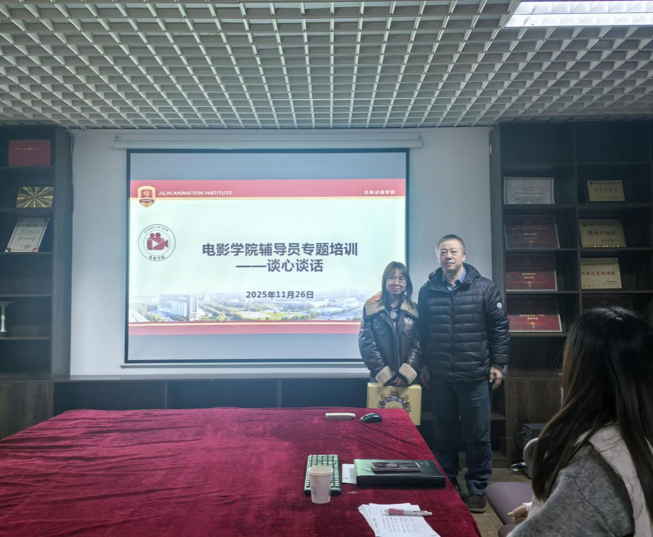 为强化辅导员业务能力,破解学生工作中谈心谈话的实操难题。2025年11月26日,电影学院以辅导员培训例会为契机,开展“谈心谈话情景模拟”专题培训,特别邀请学生工作部、学院副院长刘伟斌,学生工作部副部长董晶担任现场评审,全体辅导员参与实操演练,以模拟实战提升沟通效能。以真诚交流凝聚育人共识,以精准指导赋能成长发展。