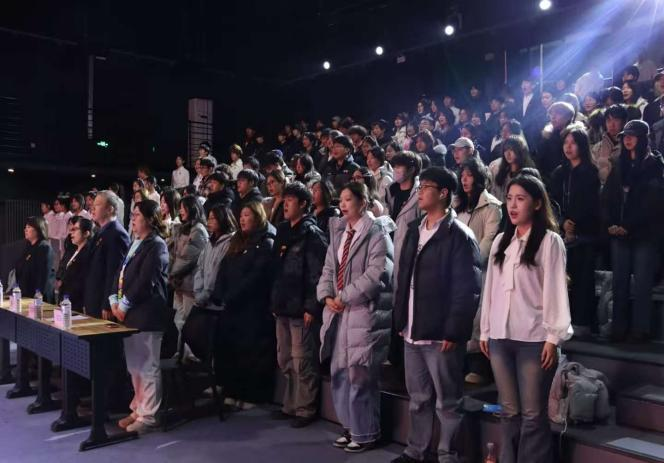 随后,全体参与人员起立,齐声合唱中华人民共和国国歌。进入颁奖环节,领导嘉宾依次为获奖学生及团体代表颁发荣誉证书与奖章,对优秀学子在创作征程的矢志不渝、学习路上的不懈奋斗与实践途中的责任担当表示肯定。优秀学生代表登台发言,结合自身在日常学习、社会实践中的亲身经历,分享实践感悟与学习心得,传递出青年影视人的初心与追求。