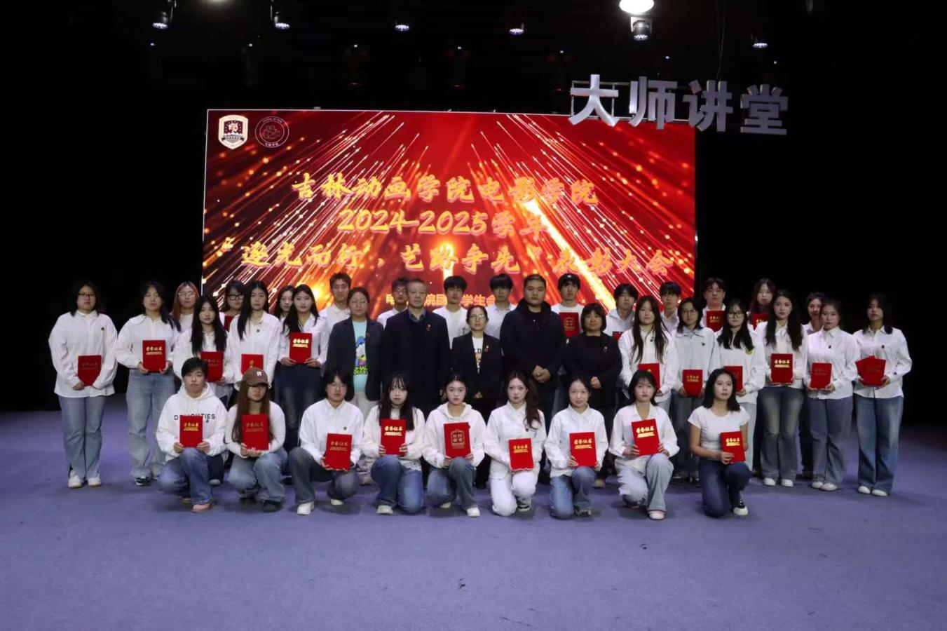 2025年11月28日,电影学院“逐光而行,艺路争先”表彰大会在青春剧场隆重举行。学院领导、师生代表齐聚一堂,共同见证荣誉时刻。此次大会主要对在学业学风、学团工作、创新创业、社会实践等多个领域,凭借扎实专业能力、突出创新精神与强烈责任担当脱颖而出的优秀团体与个人进行表彰。