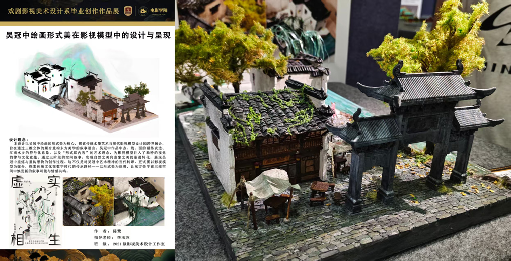 在“传统文脉与现代设计的跨界对话”板块,2021级影视美术设计工作室学生陈鹭的作品《吴冠中水墨意象的三维转译》格外引人关注。该设计以吴冠中绘画的形式美为核心,探索传统水墨艺术与现代影视模型设计的跨界融合,通过三维立体媒介重构东方美学叙事语言。创作者将吴冠中作品中点、线、面的凝练表达与江南水乡的符号化意象相结合,秉持“形式即内容”的艺术理念,为影视模型注入独特视觉韵律与文化意蕴。作品通过三阶段空间叙事,实现自然之美向意象之美的渐进转化,生动展现吴冠中提炼与重构景物的创作过程,既是对艺术家精神的当代转译,更以影视模型为媒介,探索传统文化在数字时代的传承路径,让东方美学在三维空间中焕发新叙事可能与情感共鸣。