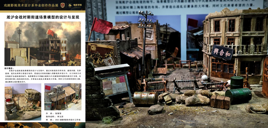 而在历史题材创作领域,张智莹同学的《淞沪会战时期街道场景模型》则聚焦抗战历史,通过对空间布局、建筑风貌、色彩基调、道具处理的细腻刻画,将战乱后的街道融入影视美术设计。场景模型融合中西融合建筑与中式建筑风格,精准还原民国时期上海街道布局,在营造战乱后萧条氛围的同时,巧妙融入象征希望的细节元素。创作者以立体叙事让观者沉浸式感受历史现场,既展现影视美术对历史场景的还原能力,更通过艺术表达传递家国情怀与时代记忆。彰显了吉动学子以艺术语言解码历史、传承文脉的多元视角与创新力量。