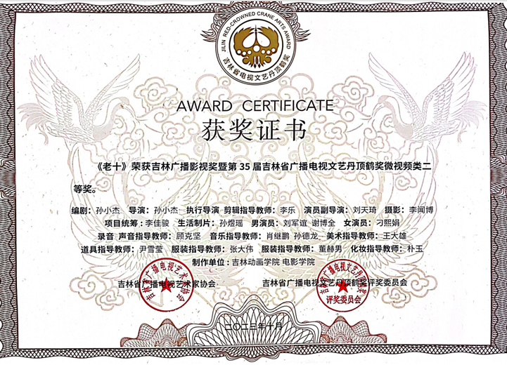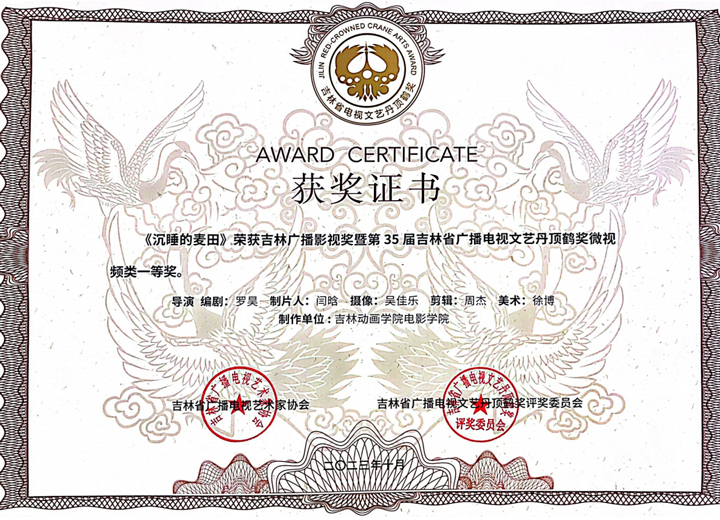 吉林广播影视奖暨第35届吉林省广播电视文艺丹顶鹤奖,创立于1988年,是吉林省委宣传部批准设立的唯一的广播电视文艺政府奖,是吉林省广播电视文艺最高奖。本次共有来自全国各大高校二百五十余部作品参评,经历层层评选,我校电影师生共同创作的《沉睡的麦田》《老十》脱颖而出。