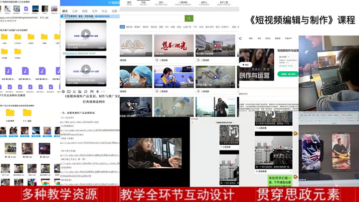 网络与新媒体专业《短视频编辑与制作》课程,任课教师温丽君以 OBE 教学理念为指引,注重线上与线下全流程互动式教学设计,将 PQRST 五步读书学习法和任务驱动式教学方法相结合。将抗疫精神、家国情怀等思政元素融入教学内容,注重典型案例与时事热点的有机融合,采用启发式教学引发学生思考,使教学内容更加生动。注重课堂教学质量与学生的学习效果,将课程章节目标进行拆解,整合多种优质线上资源,充分利用腾讯会议直播与QQ 家校群、微信群等多种教学工具,将优质慕课、知识点录播微课、直播、优质教学资料和典型案例相结合,依托吉林省金课团队创设的优质资源库,打造线上立体化沉浸式学习云资源库,满足学生自主学习与个性化学习需求。