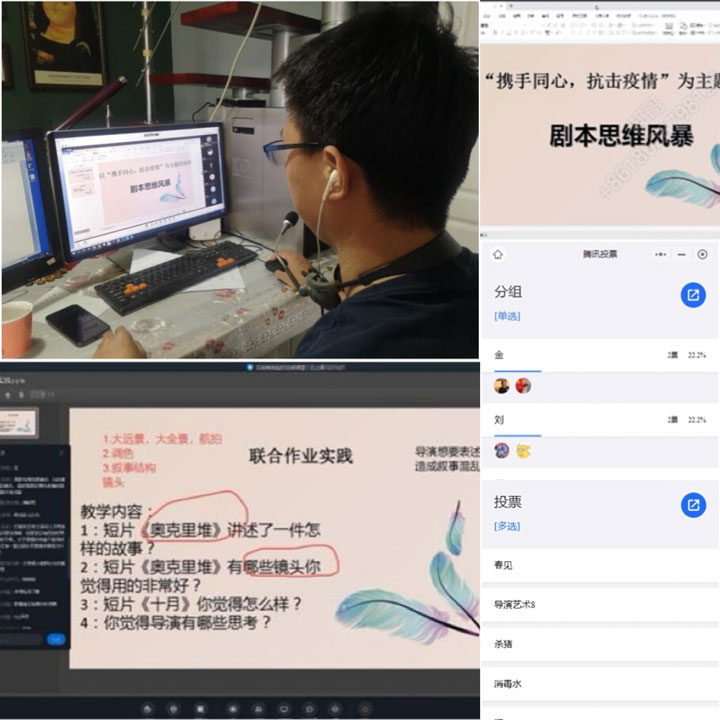 导演专业《联合作业实践》课程,任课教师郝丰富根据整体疫情防控形势,预设三种教学方案,通过大联合方案、小联合方案、单人作业三种方式,结合多种线上教学模式进行实践课程讲授。积极响应学校下发的以“携手同心 抗击疫情”为主题的创作号召,引导学生创作抗疫题材微电影剧作,为学生设置 “疫情”、“封闭空间”、“春天”、“寝室”等关键词,指导学生课上、课下作品创作,确保后续创作高度的可执行性。