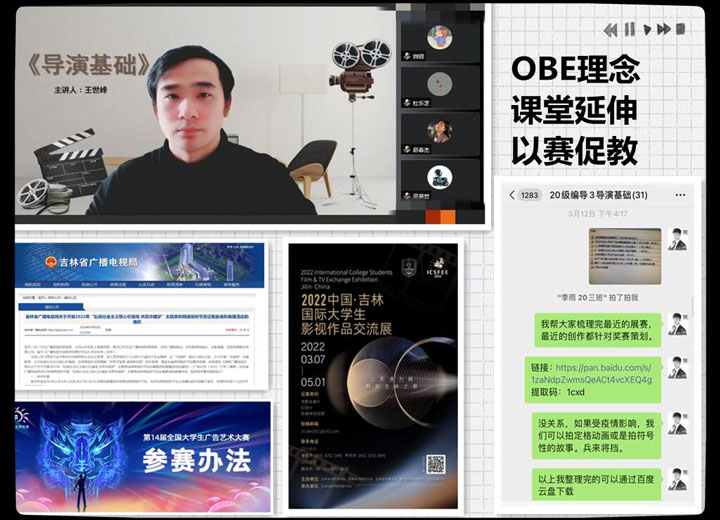 编导专业《导演基础》课程,任课教师王世峰基于OBE教学理念进行整体课程规划,通过“教、赛、创”三位一体的创新授课方法,以“社会主义核心价值观”为主题导向,将“讲好中国故事”融入教学内容,带领学生进行真实故事改编的影视实训创作,对学生进行正向的价值引领,激发学生对艺术再创作的审美思考。将教学实践、参展参赛、创新创业三者有机结合,全面提升学生知识、价值与能力等综合素养。