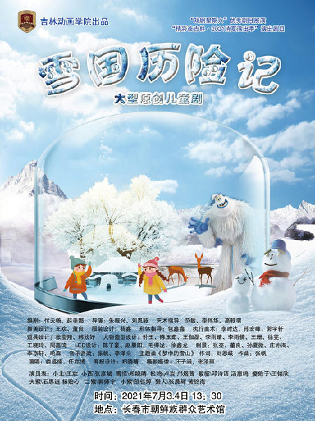 2021年7月3日、4日下午,由吉林动画学院与长春市艺术研究所联合创作的原创儿童舞台剧《雪国历险记》,在长春市朝鲜族群众艺术馆演出。本剧是由吉林动画学院儿童剧创作工作室朱振兴、刘恩岐担任导演,长春市艺术研究所艺术活动部主任付天杨编剧。此部作品充满童真和乐趣,展现东北地域特色,彰显东北冰雪魅力。