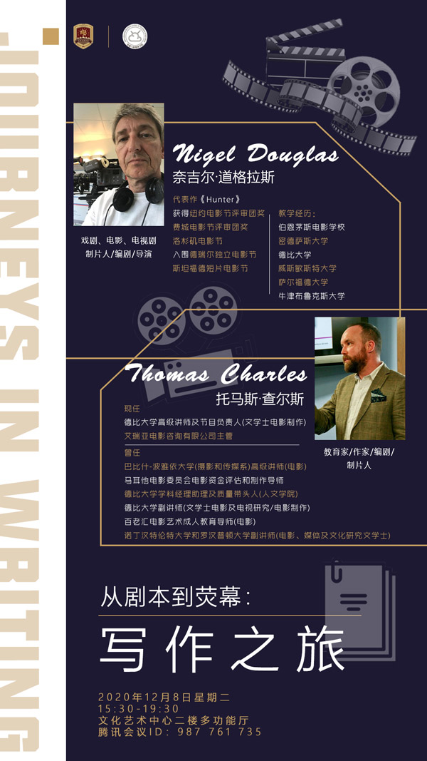 电视与新媒体学院邀请英国德比大学艺术人文与教育学院两位专家于2020年12月8日17:30 开展线上、线下相结合讲座。两位专家分别是英国戏剧、电影、电视剧制片人/编剧/导演、德比大学奈吉尔·道格拉斯教授和教育家、作家、制片人、英国德比大学 托马斯·查尔斯教授。