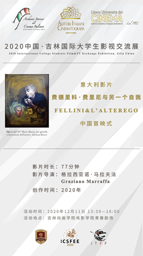 2020年是电影大师费里尼诞辰100周年。我校与意大利巡回电影节组委会联合主办了费里尼纪念影片《费德里科·费里尼与另一个自我》中国首映活动,本次活动由吉林动画学院电影学院承办。影片于12月11日下午一点半在电影学院青春剧场展映,电影学院院领导和师生共同参加观影活动。