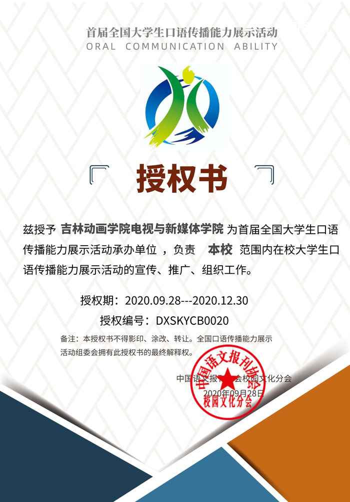 为提升当代大学生口语传播能力,突出学生口语的生成性、互动性、过程性和情景性。中国语文报刊协会校园文化分会、《语文世界》杂志社联合天津师范大学新闻传播学院等各高校于2020年9月启动首届全国大学生口语传播能力展示活动。吉林动画学院电视与新媒体学院被授予为此次活动的承办单位。