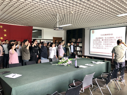 在学校党委的号召下,时值第35个教师节来临之际,电影学院组织学习《新时代教师职业行为十项准则》,全体教师面向国旗庄严宣誓。