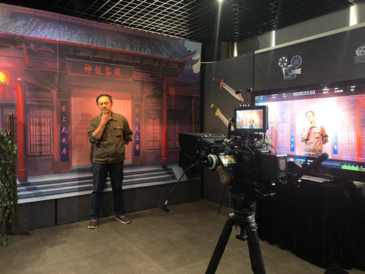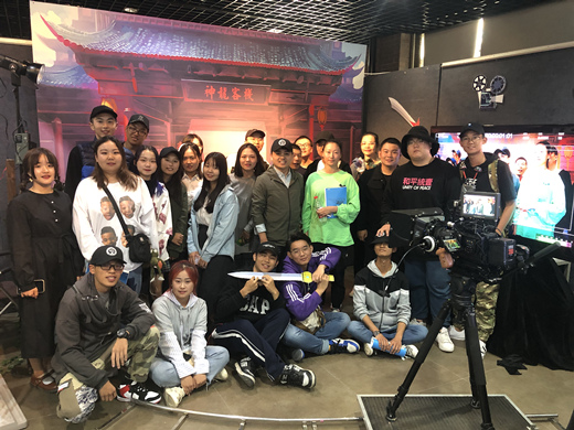 在学校“学研产一体化”办学特色下,电影学院面向影视产业特色人才培养,构建产教融合育人体系。充分发挥学产对接实践教学平台优势,围绕电影、网络大电影等产业项目,带动了影视类专业和影视工业化全流程体系建设等方面实践教学。在学校校缘产业公司的推动下,2018年以来,围绕青春校园、古装武侠等题材,学生参与创作了4部故事片电影。此次参展,在院长助理隋广宁老师的带领下,利用平台项目的专业优势,打造沉浸式影视互动展区。学生们可以在镜头前模拟2019年暑期学校拍摄完成的电影《神龙客栈》项目的拍摄场景,并可以在现场大屏幕中看到自己演出的情景,使得参观师生对电影拍摄知识有了进一步了解,同时对我校刚刚拍摄完成的电影《龙门客栈》产生了极大的心理期待。