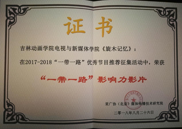 在2017—2018“一带一路”优秀节目推荐征集活动中,吉林动画学院电视与新媒体学院推送的纪录片《旋木记忆》荣获“一带一路”影响力影片。