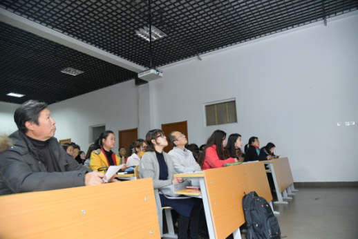 (比赛现场,评审团成团认真聆听参赛教师讲课)