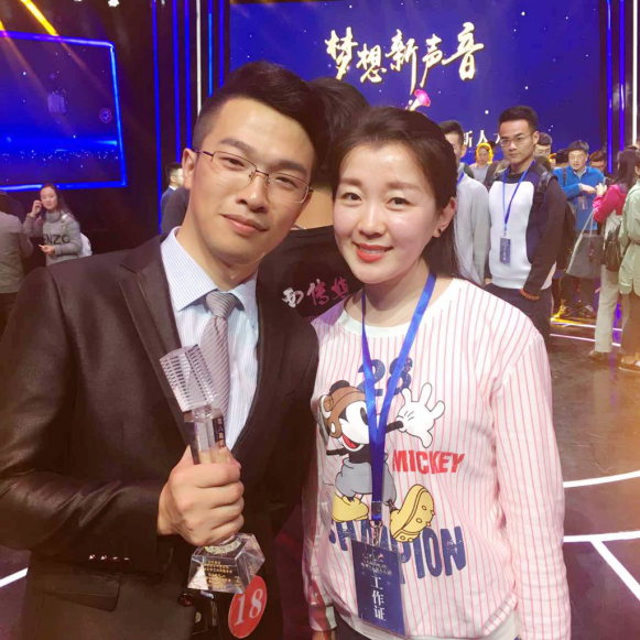 (电视与新媒体学院2013级播音与主持艺术系学生刘麟荣获金奖,与院长助理刘婷婷合影留念)