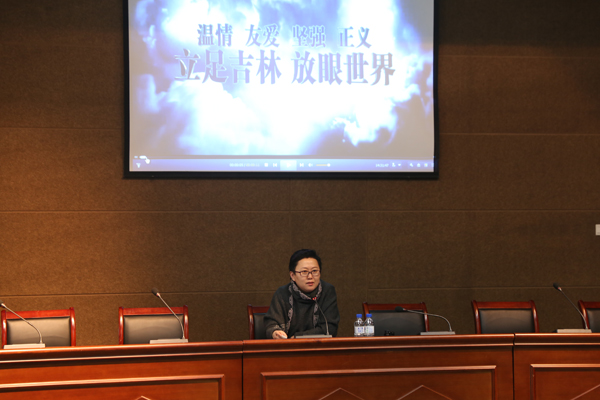(中央电视台吉林记者站站长万灵同志在讲座现场)