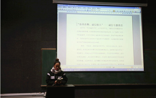 秘书处代表发言人上台宣读本次诚信教育的重要内容。以学生作弊的案例引出对学生诚信考试,诚信做人的五点要求,希望同学们要在端正考风、严肃考纪、文明答题、诚信应考,在公平、公正、公开的竞争平台中自我检验,以诚信的行为铸就诚信的人格,为全院学生的诚信考试起带动作用。整个现场气氛庄重严肃,充分体现了同学们对诚信考试践行的决心。