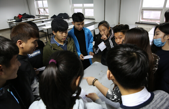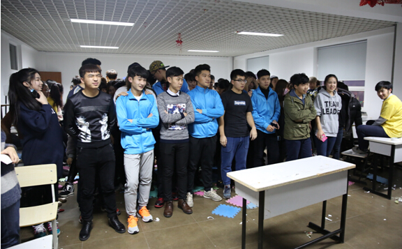 游戏环节结束后,所有人员来到了612准备最后的撕名牌活动,学生们又把自己的名牌重新牢固了一下,做着热身运动,商量自己队伍的策略,主席团成员也参与其中,所有团委学生会的人整装待发。