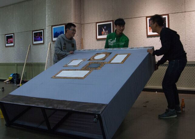2015年5月13日,“青春剧场”上演了由表演系吴瑶老师执导的话剧《背惊》。华丽的布景、精湛的演技为演出增光添彩。然而,在成功演出的背后我们没有忘记那些幕后工组者:绘景工作人员。为了确保本次演出能够顺利完成,戏美专业李玉苏老师带领13级舞台美术系学生共同完成了此次话剧的布景工作。他们牺牲了自己的周末时间,不计辛苦,从最初的搜集风格、设计草图、整理方案到动手绘制,均体现出了舞台美术工作者的认真态度和专业审美水平。最终历时三天,呈现出一个二十世纪初的欧洲贵族家庭的装饰场景,包括精致的欧式壁炉、人物画像、金色画框和窗户等。话剧《背惊》上演后,精良的绘景获得了观众和专业同仁们的众多好评和赞许。