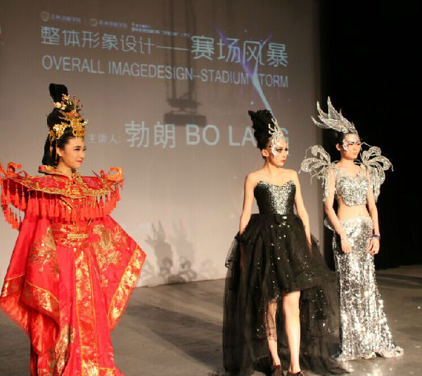 在讲述的同时,现场三位化妆造型师分别为学生模特设计了三款夸张且华丽的妆容造型。有古典有现代,每个造型都各具特色,夸张而不失优雅,华丽且不显庸俗,从打底到眼影、腮红、唇部的设计,面部的装饰都恰到好处,让同学们享受视觉盛宴的同时受益颇深。