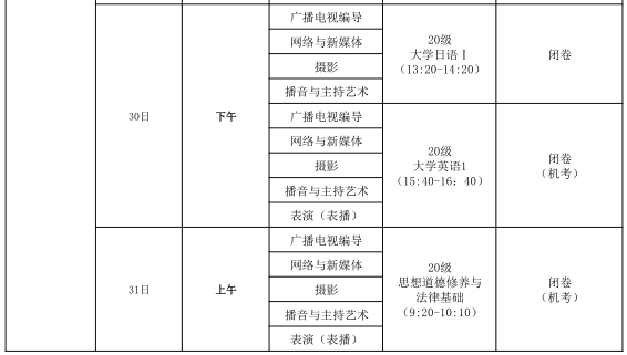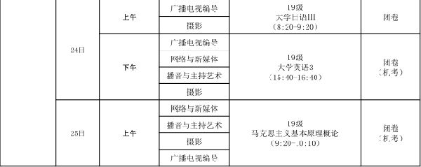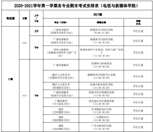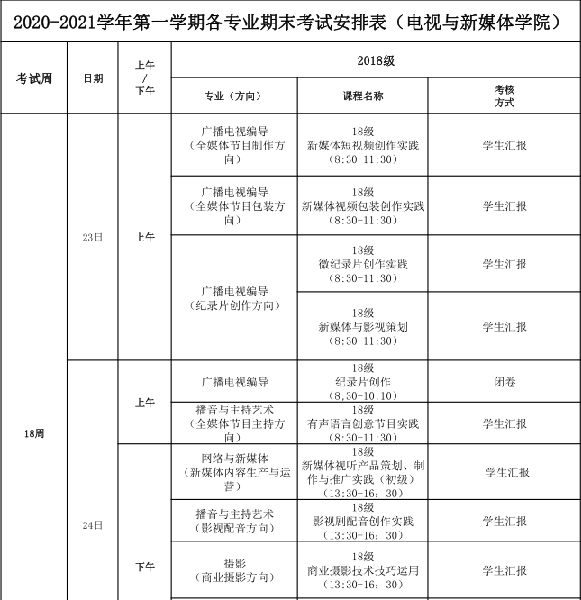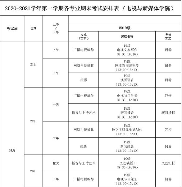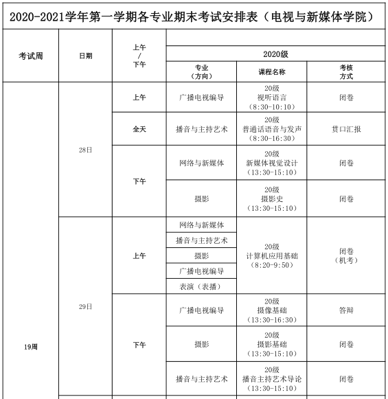 电视与新媒体学院 2020-2021学年第一学期各专业期末考试安排表